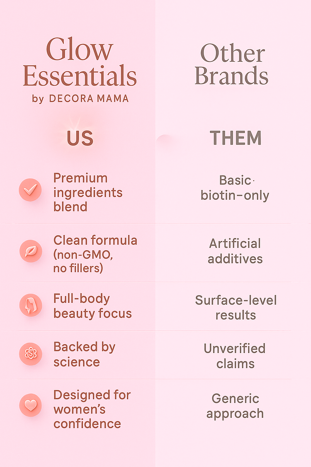 Not all beauty supplements are created equal. While most rely on basic biotin blends, Glow Essentials combines clinically backed vitamins, minerals, and botanicals that target beauty from within — supporting real results, not quick fixes.